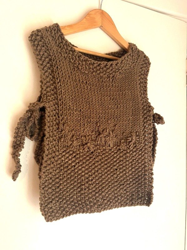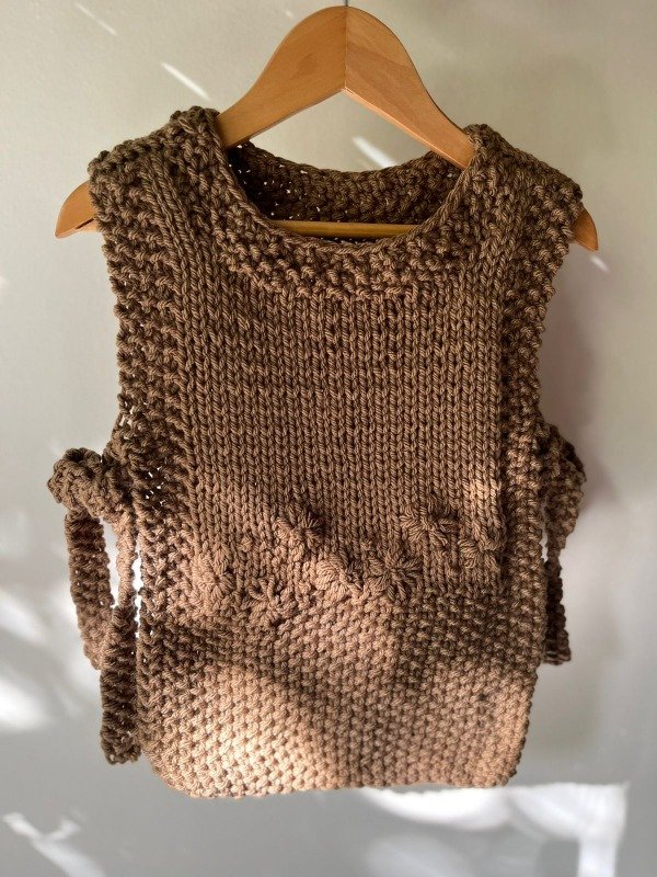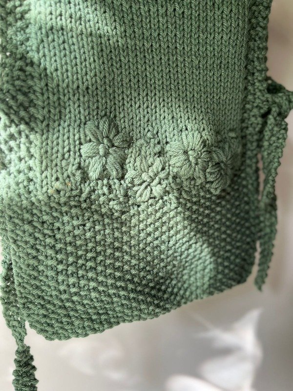 Chaleco tipo pechera con lazos laterales y flores bordadas en el mismo tono. Tejido y bordado a mano en lana.